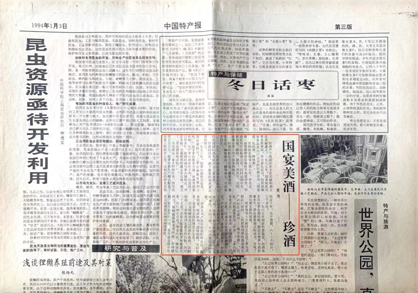 1994年1月3日出版的《中國特產報》介紹“國宴美酒”珍酒